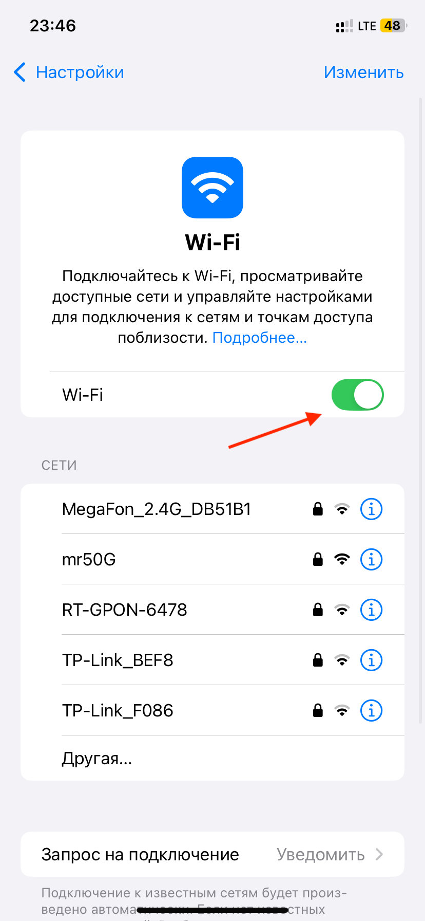3. Включите Wi‑Fi. Убедитесь, что переключатель Wi‑Fi находится в активном положении. После включения устройство автоматически начнёт поиск ближайших доступных сетей.