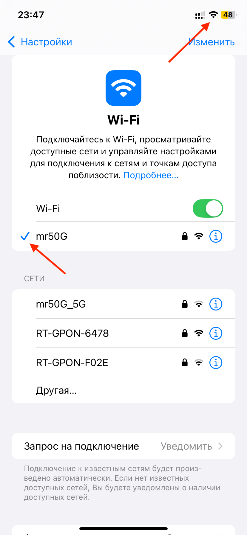 6. Убедитесь в успешном подключении. После подключения рядом с названием выбранной сети появится галочка, а в верхней части экрана — значок Wi‑Fi. Это означает, что устройство подключено к интернету через выбранную сеть.