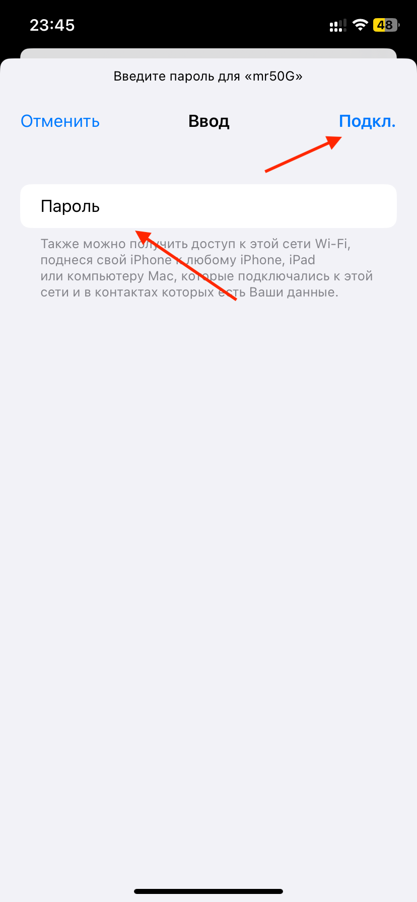 5. Введите пароль. Если сеть защищена, откроется окно для ввода пароля. Введите корректный пароль доступа к сети и нажмите «Подключиться». Если данные введены верно, соединение будет установлено.