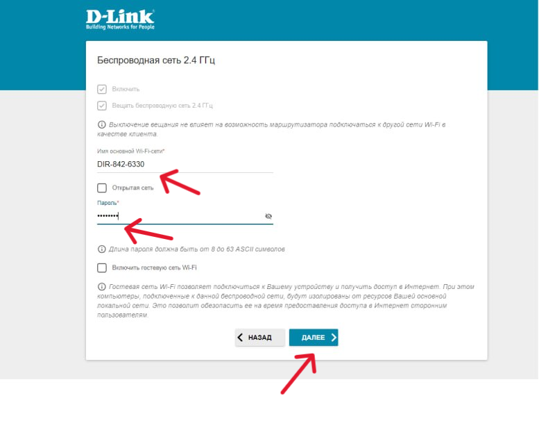 6. Следующим шагом является установка наименования и пароля Wi-fi сети, данный роутер поддерживает несколько диапазонов частот, (2.4 Ггц и 5 Ггц) поэтому вам потребуется ввести данные для обеих сетей.