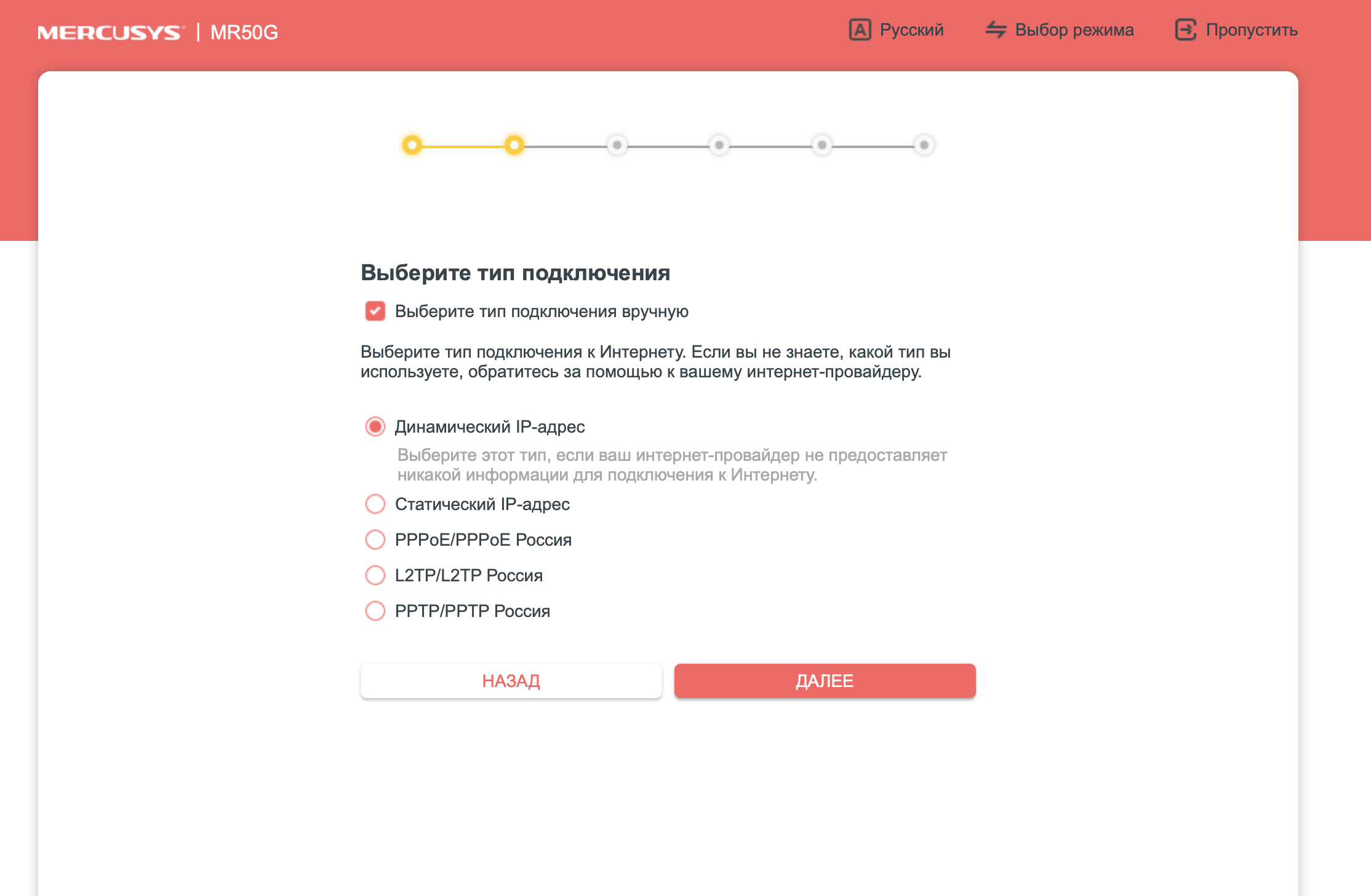 Шаг 2. Выбираем из выпадающего списка в «Тип подключения» – «Динамический IP», нажмите «Далее», т.е. стрелку чуть ниже;