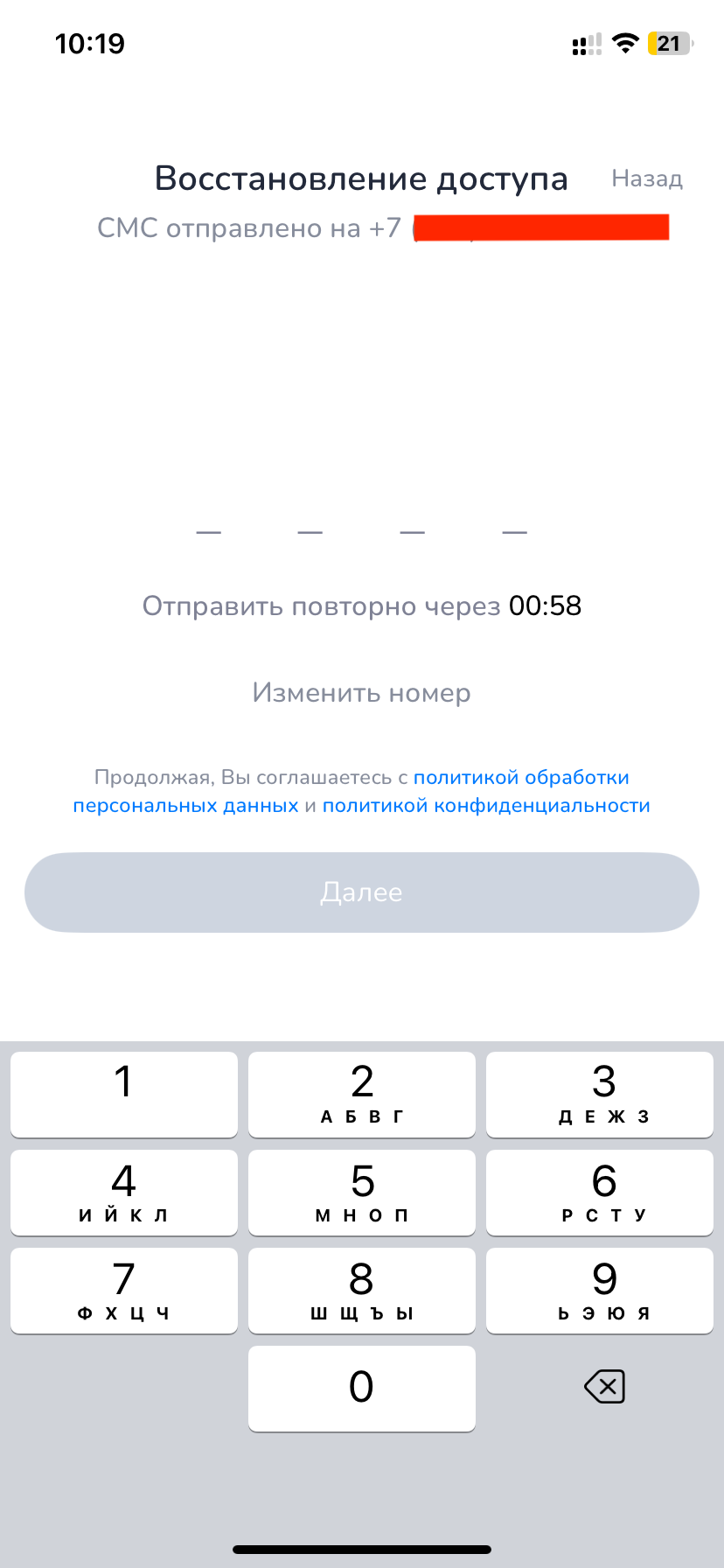 После нажания на "Забыли код?" Вам придет СМС с кодом подтверждения, его нужно будет ввести в появившемся окне.